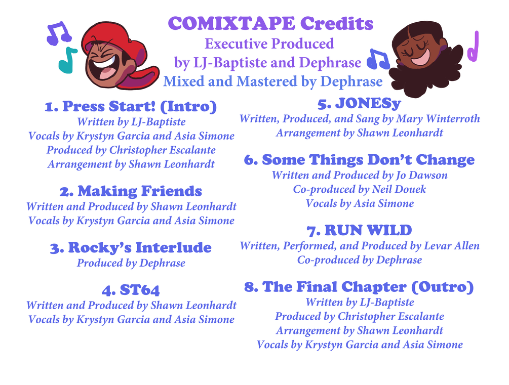 COMIXTAPE is a character song EP based on and about the characters and world of COMIXSCAPE. Featuring a variety of songs sung by and about the characters by a variety of artists, this is the newest, most unique companion piece to this story yet, and a way to experience this cast of personalities like never before.